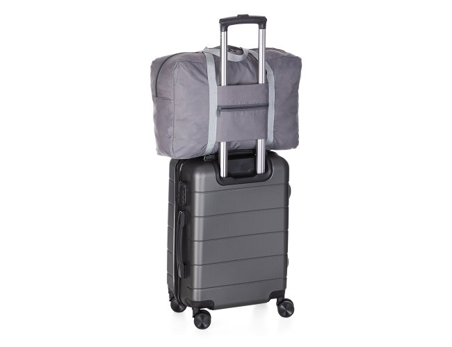 Contém bolso para encaixe em malas de viagem. Bolsa de viagem dobrável 24 litros em poliéster impermeável com dois compartimentos.