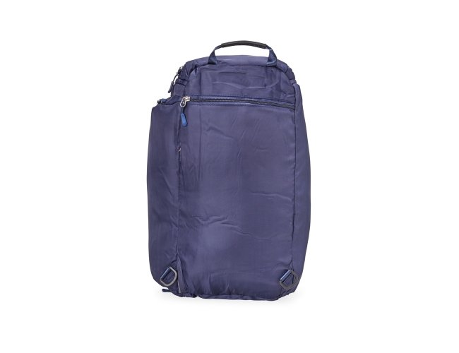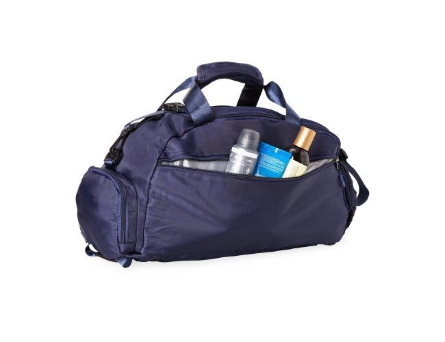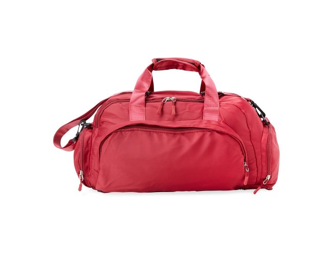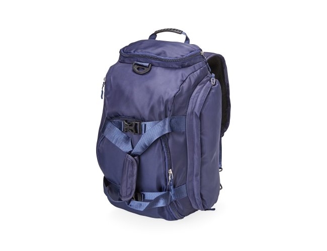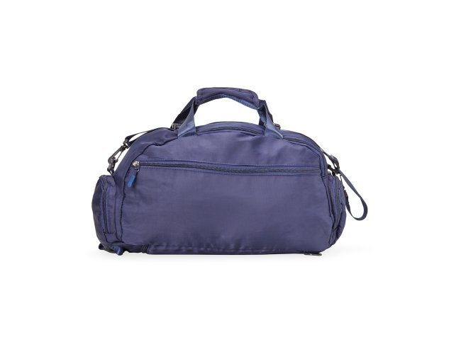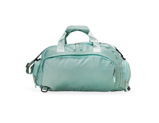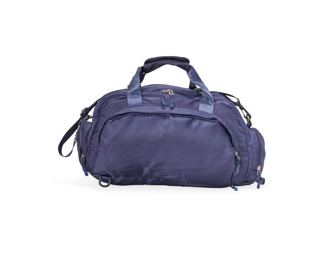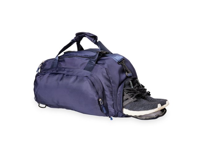 Bolsa esportiva de 32 litros em poliéster de impacto impermeável com cinco compartimentos, sendo três deles exclusivos para tênis, itens molhados e armazenamento das alças de costas. Com alça transversal removível e alça de mãos com suporte de juntura, a bolsa contém alças de compensação e alças para as costas ocultas no compartimento inferior, podendo ser transportada como mochila.