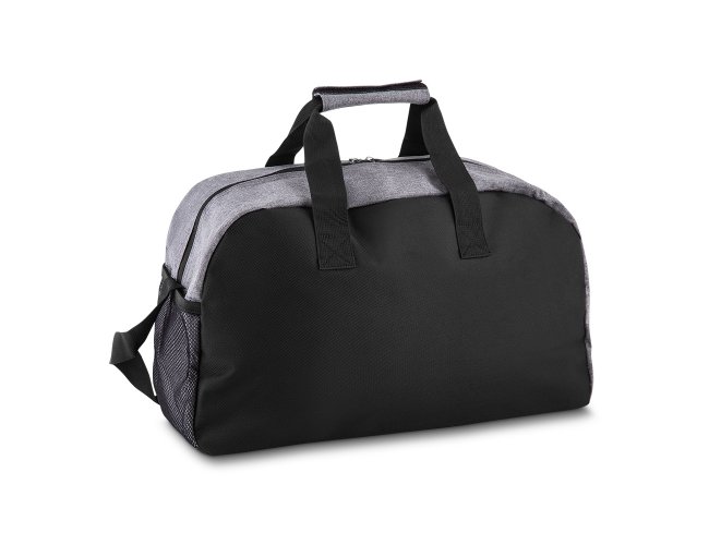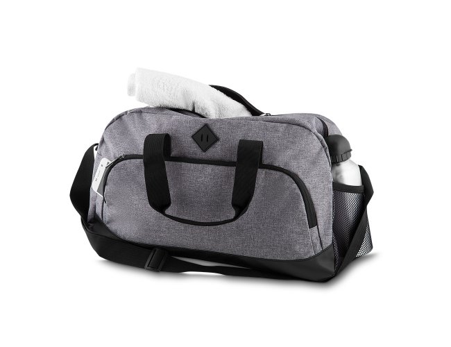 Bolsa esportiva de poliéster. Possui bolso frontal, bolso lateral de malha e bolso grande superior. Alça de mão com pegador cinza de velcro e alça transversal ajustável.