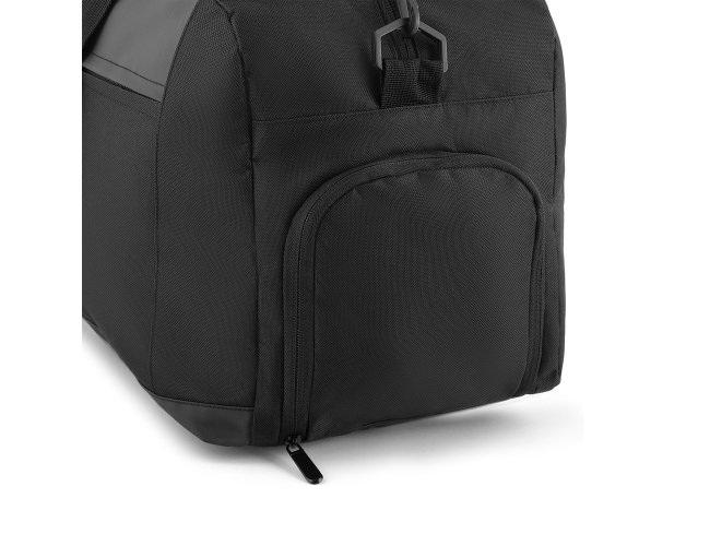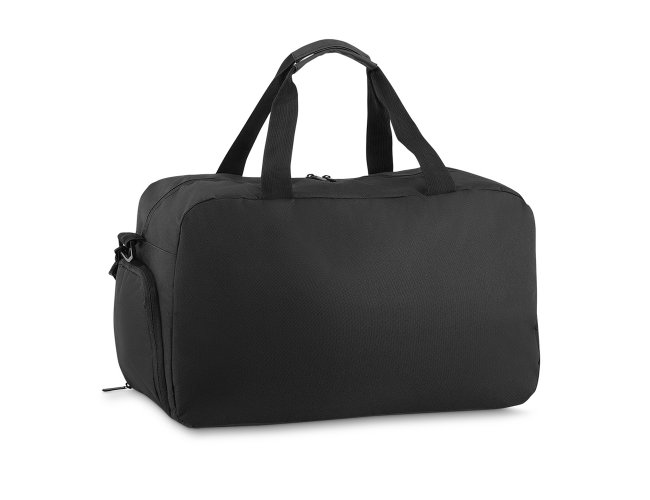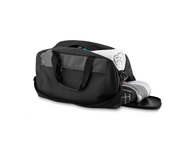 Bolsa esportiva de poliéster com abertura lateral para calçados, compartimento superior isolado para pertences molhados e bolso com abertura frontal. Possui alças para mãos com pegadores emborrachados, alça transversal ajustável e detalhes emborrachados no bolso frontal e área inferior da mala.