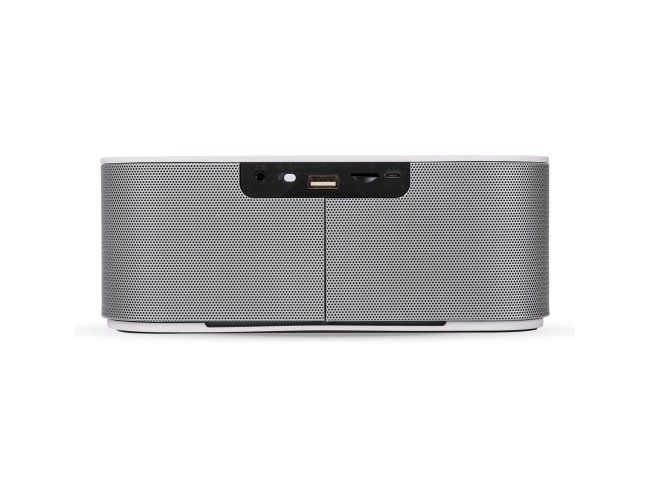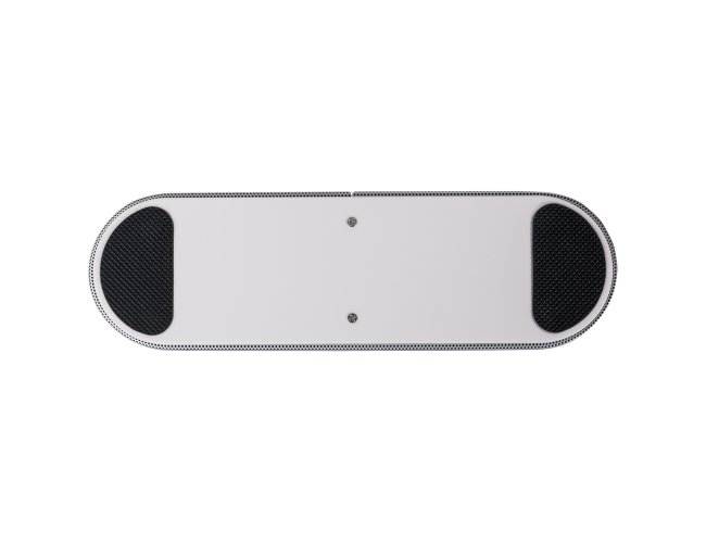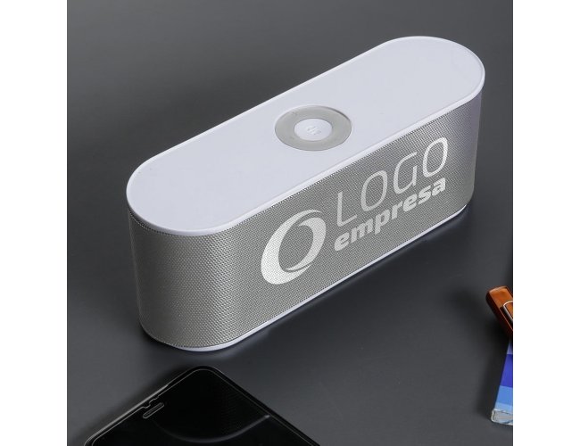 Caixa de Som Multimídia. Design fino e material plástico resistente, possui: botão On/Off no verso, botão >