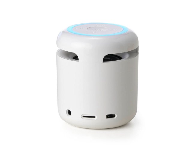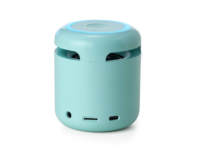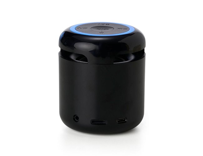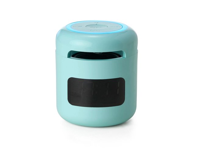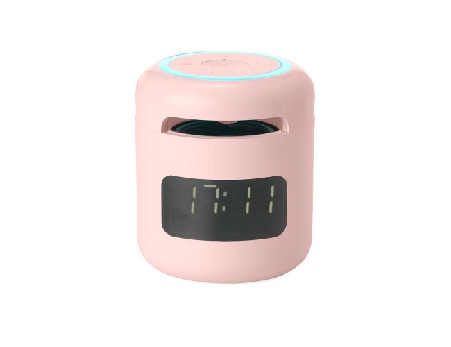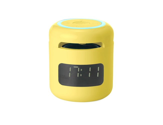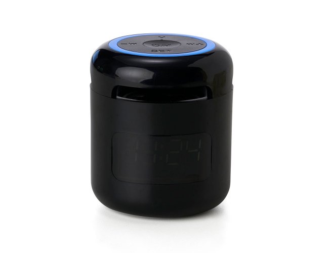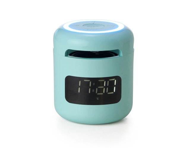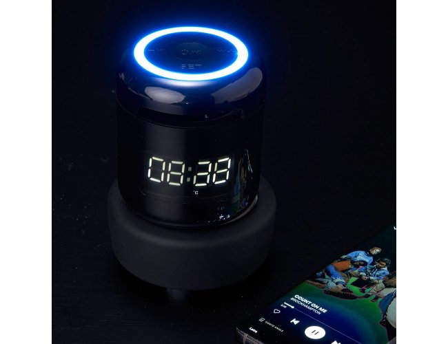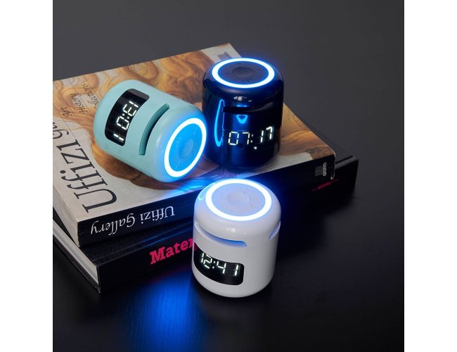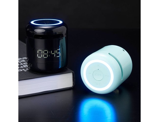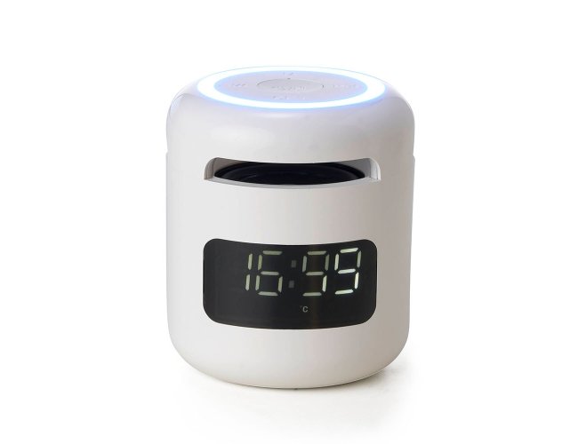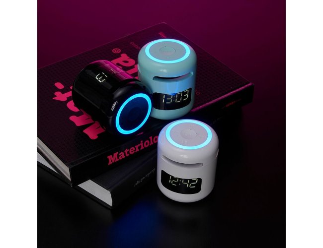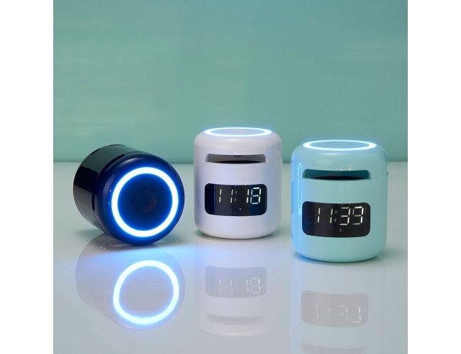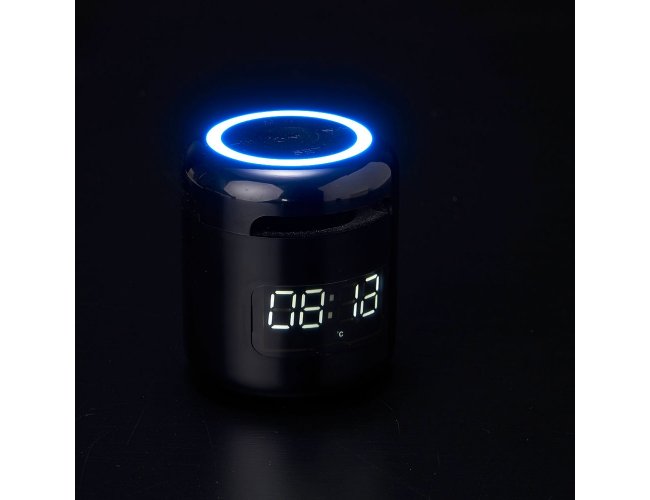 Caixa de som multimídia com relógio despertador. Produzida em plástico e com borrachas antiderrapantes na área inferior, a caixa de som tem bateria de longa duração, display de LED na área frontal, e anel de led brilhante na parte superior. A caixa de som executa nos modos bluetooth, rádio FM, cartão TF-microSD e entrada auxiliar P2. Acompanha cabo USB e manual em inglês e chinês.