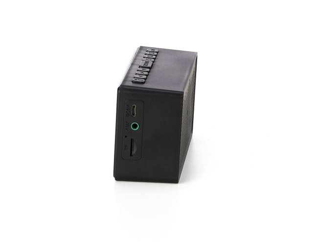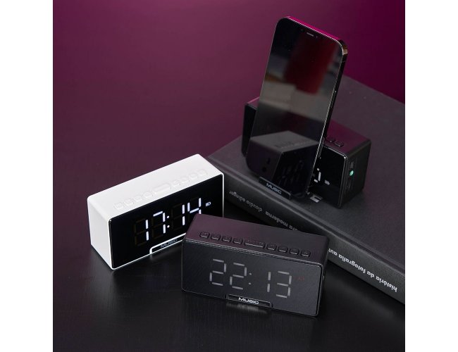 Caixa de som multimídia com relógio despertador e suporte para celular. Produzida em plástico e com borrachas antiderrapantes na área inferior, a caixa de som tem a área frontal com display de LED, além de um compartimento com suporte para celular ? uma espécie de ?gaveta? aonde é exibido (MUSIC), basta puxá-la ter acesso ao compartimento. A caixa de som executa nos modos bluetooth, cartão TF-microSD e entrada auxiliar P2. Acompanha cabo USB e manual em inglês.