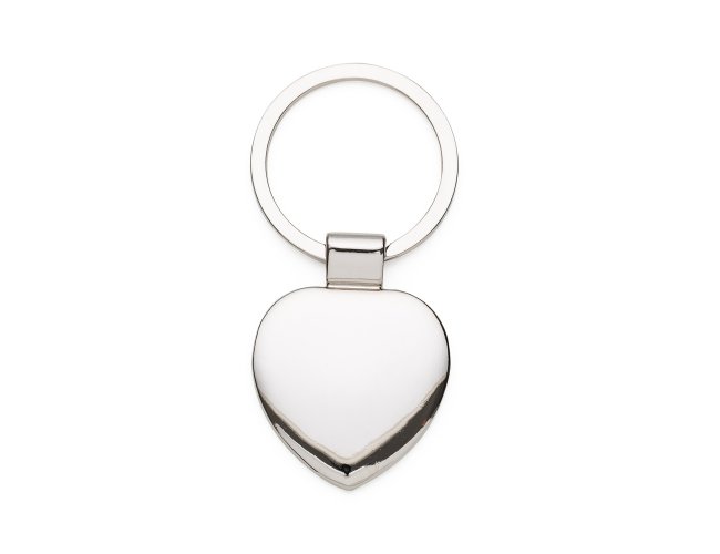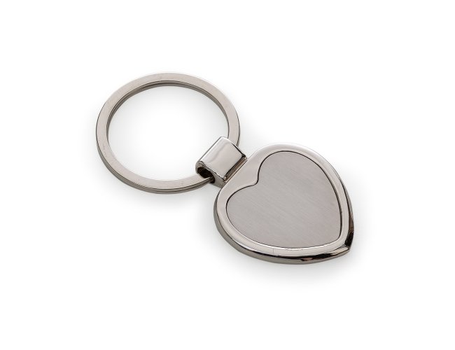 Chaveiro de metal formato coração, possui chapa central em inox e verso brilhante liso.