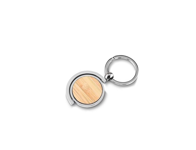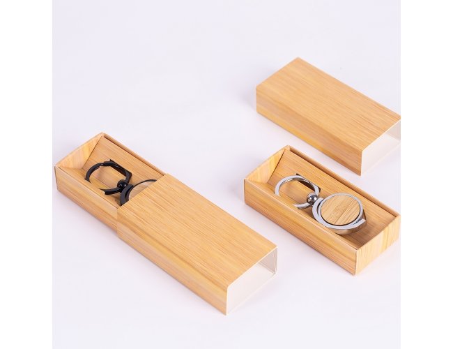 Chaveiro de metal, com detalhe circular de Bambu. Acompanha estojo de papel.