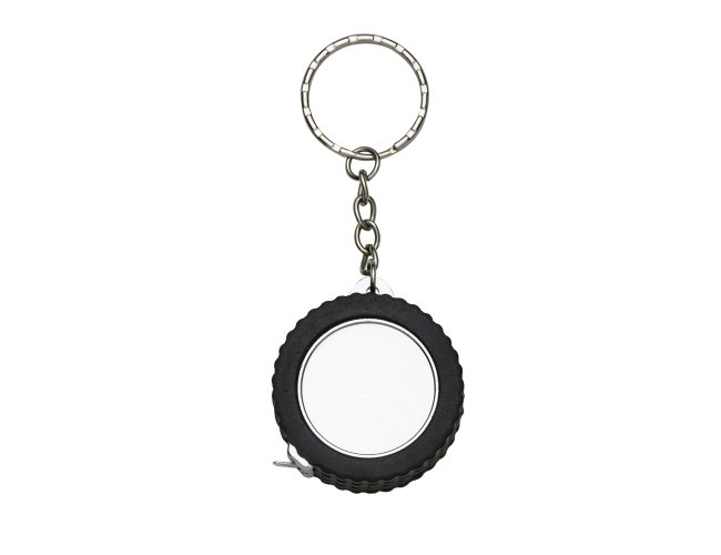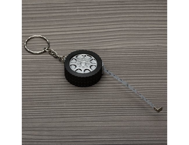 Chaveiro trena 1 metro formato pneu brilhante, material emborrachado com relevo. Detalhes do aro em plástico prata, verso liso. Trena não possui trava.