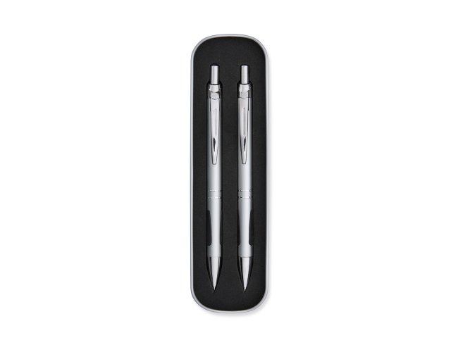 Conjunto de caneta e lapiseira metálicas em estojo de metal. Caneta e lapiseira possuem acabamento fosco, detalhe emborrachado na parte inferior, carga esferográfica azul de 1.0mm e acionamento por clique. Estojo revestido em espuma.