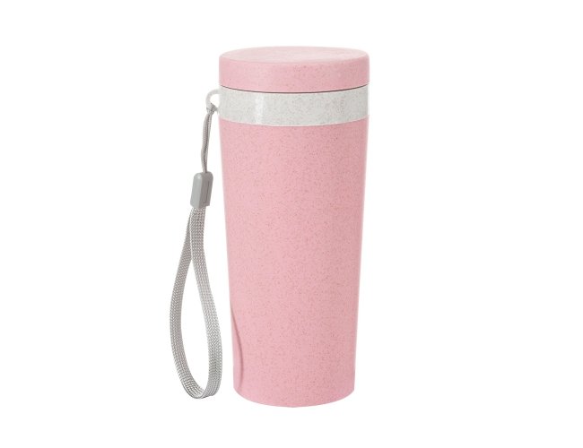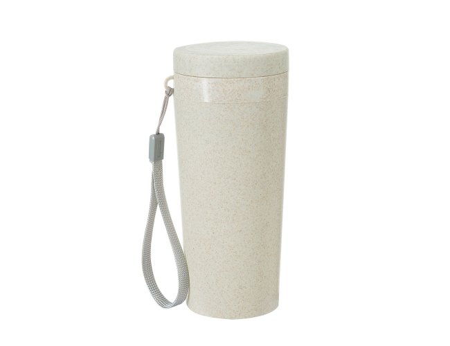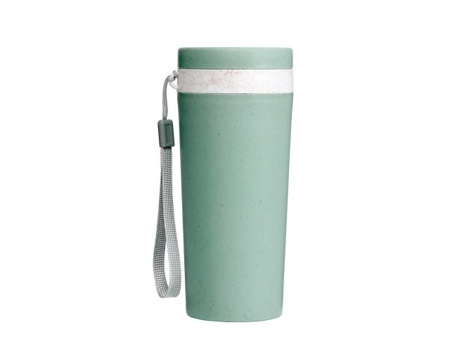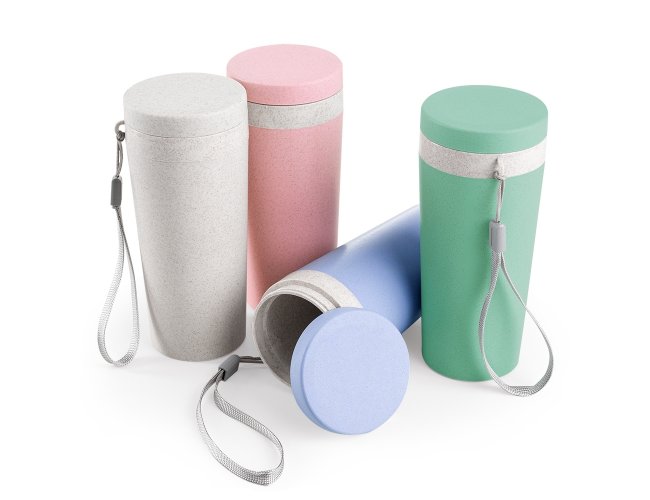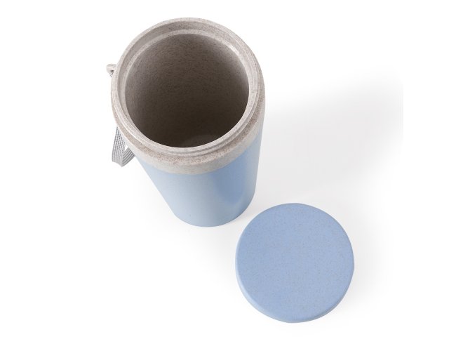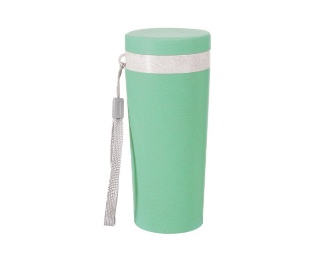 Copo fibra de bambu 350ml com parede dupla e alça. Copo produzido em Polipropileno livre de BPA, possui uma tampa de vedação rosqueável e alça de nylon (removível) para transporte. Conserva a temperatura interna durante um período de 1 à 2 horas, mas não dispõe de isolamento térmico. O copo pode ser levado a lava-louças, geladeiras e micro-ondas.