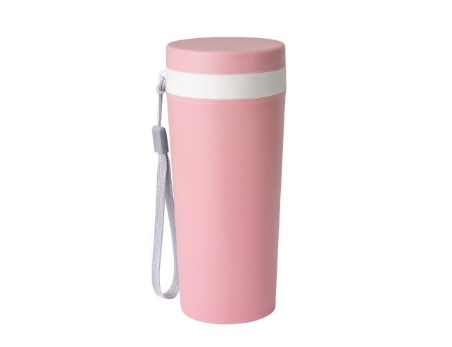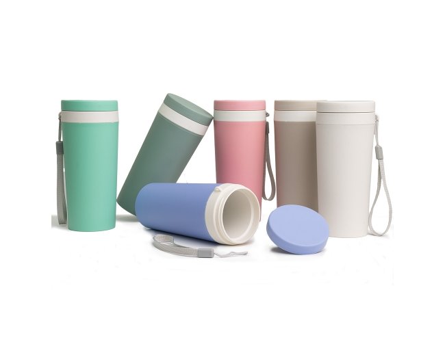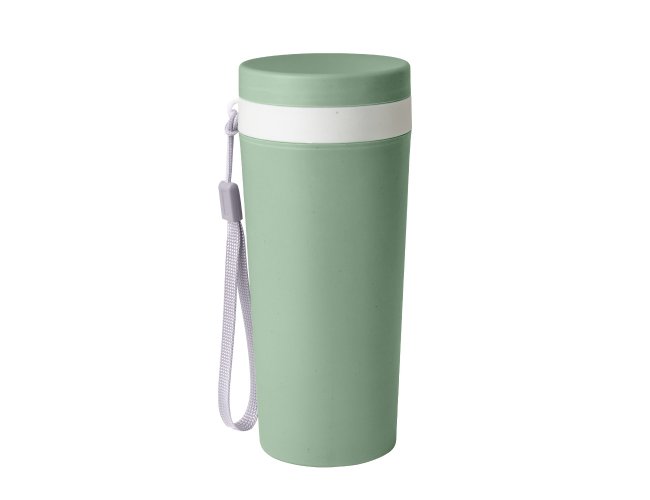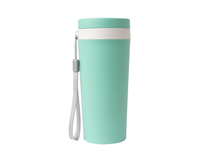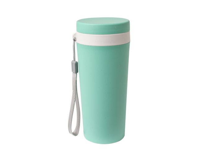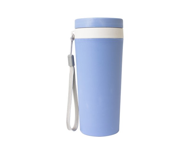 Copo fibra de bambu 350ml com parede dupla e alça. Copo produzido em Polipropileno livre de BPA, possui uma tampa de vedação rosqueável e alça de nylon (removível) para transporte. Conserva a temperatura interna durante um período de 1 à 2 horas, mas não dispõe de isolamento térmico. O copo pode ser levado a lava-louças, geladeira e micro-ondas.