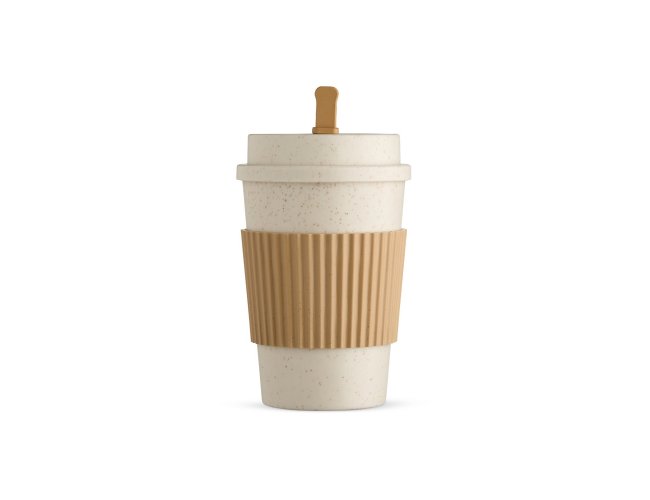 Copo Fibra de Trigo 450ml com tampa rosqueável. Acompanha mexedor e manga protetora antiderrapante.