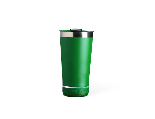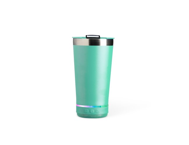 Copo térmico de inox com caixa de som e capacidade 400ml. Contém tampa com abridor. Caixa de som possui botão para ligar/desligar, botões para aumentar diminuir volume/ avançar e retroceder faixas. Operante no modo bluetooth e entrada TF (cartão MicroSD). Acompanha cabo USB Tipo-C. Obs.: A caixa de som não é a prova dágua, para a higienização do copo é necessário desrosquear a caixa de som para remove-la.