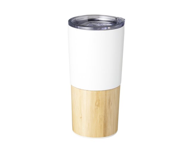 Copo térmico de inox 600ml com parede dupla e detalhe de bambu. Tampa com acesso ao bocal e trava de segurança.