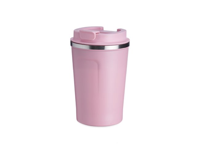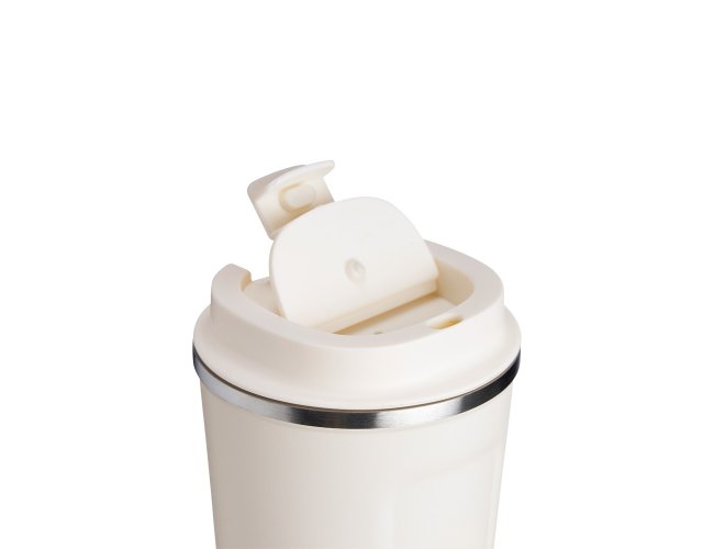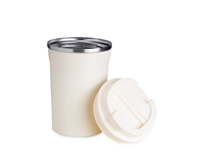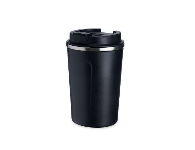 Copo térmico de inox 350ml com parede dupla, parte inferior com borracha antideslizante e tampa rosqueável com abertura de bocal.
