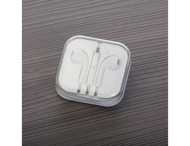 Fone de ouvido estéreo com microfone e controle de volume. Fone de ouvido plástico na cor branca, entrada P2, possui indicativo L(left) e R(right) na área interna do fone, detalhes internos vazados no fone(possibilita a visão da tela de proteção), microfone acoplado no suporte com desenho indicativo e no verso do suporte controle de volume com desenho indicativo ? e +. Acompanha embalagem plástica branca com tampa acrílica transparente. OBS.: Botões de volumes funcionam apenas em aparelhos da linha APPLE.