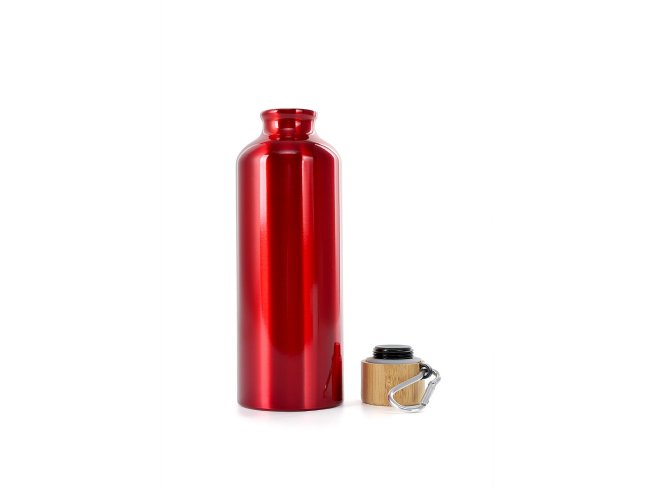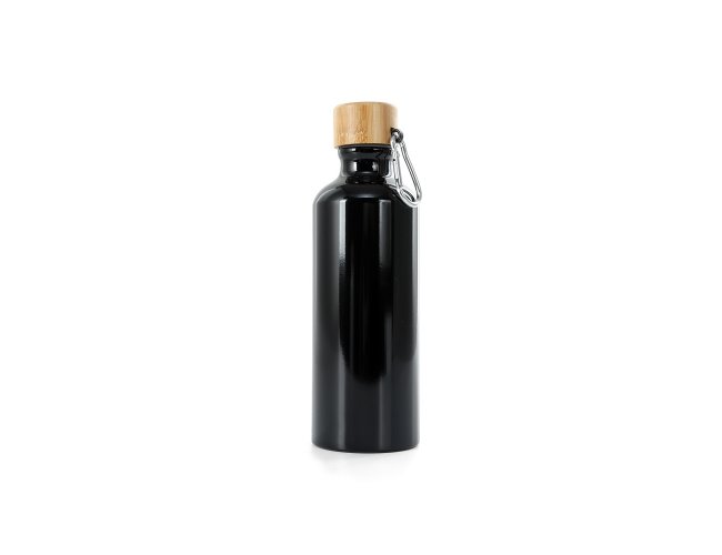 Garrafa de alumínio com capacidade de 500ml. Possui tampa de bambu e acompanha mosquetão de alumínio.