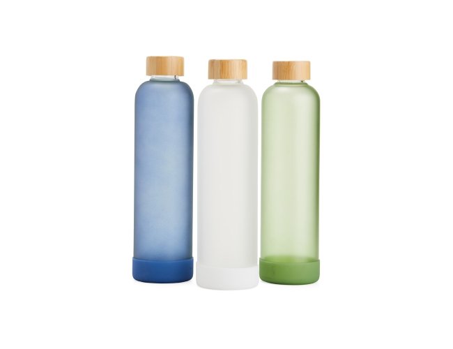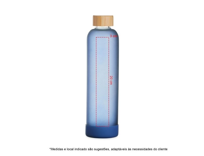 Garrafa de vidro borossilicato com capacidade de 1 litro. Contém tampa de bambu e base de silicone anti-impacto (removível).