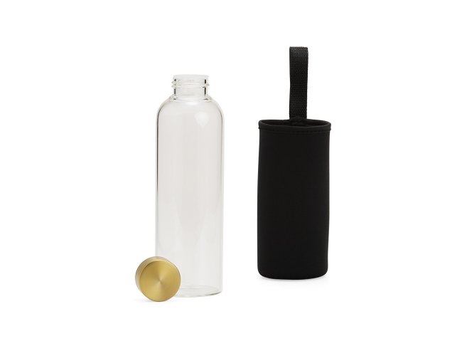 Garrafa de vidro borossilicato com capacidade de 650ml, acompanha capa de neoprene com alça para transporte. Tampa de alumínio.