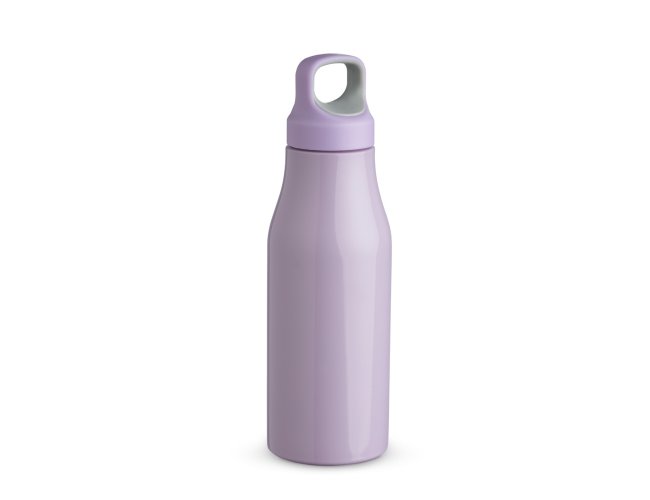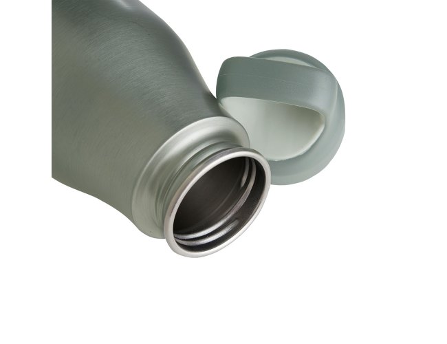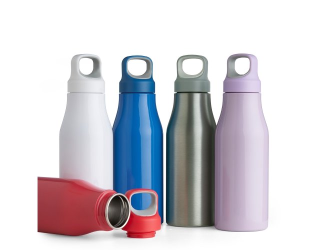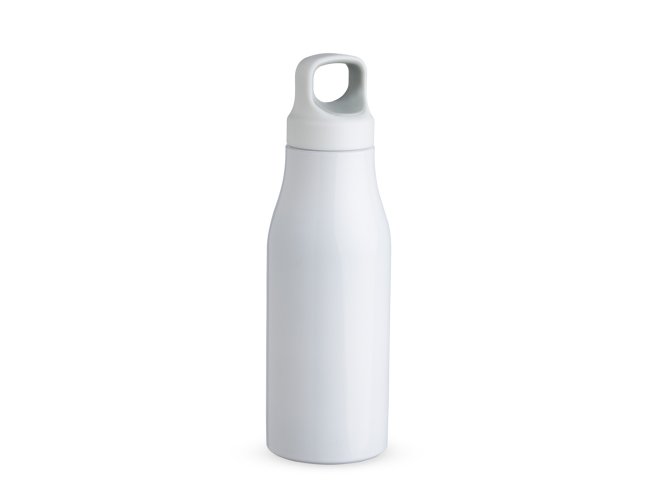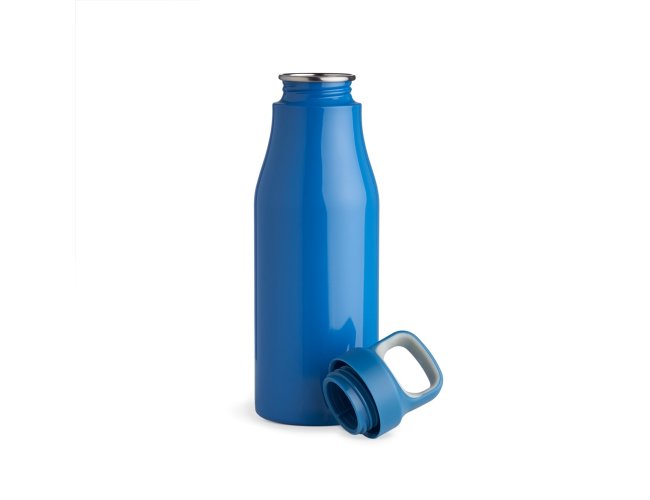 Garrafa 650ml em inox com tampa rosqueável com alça para transporte.