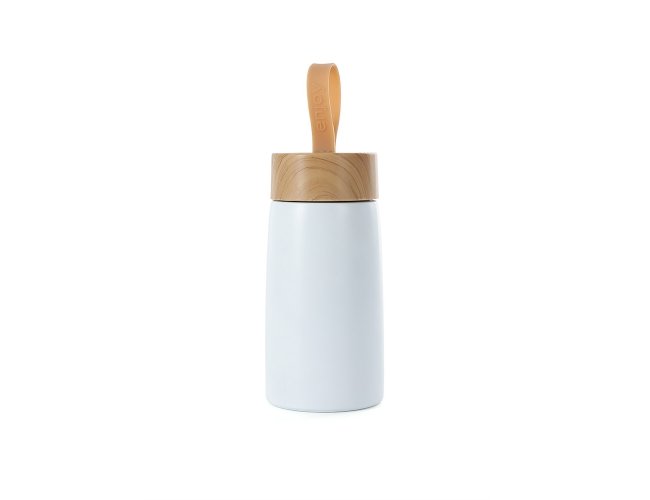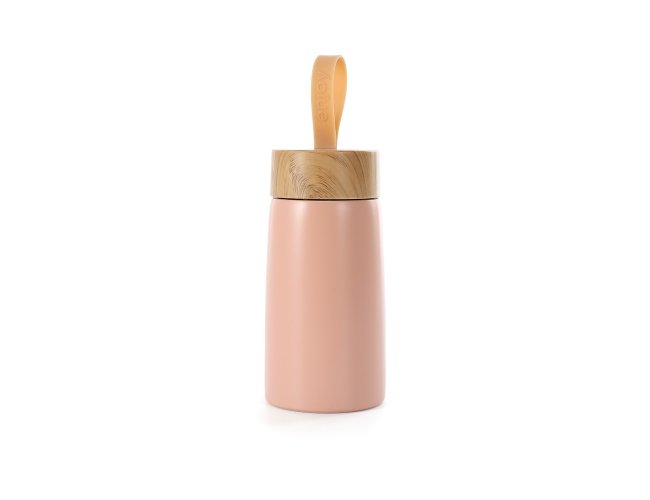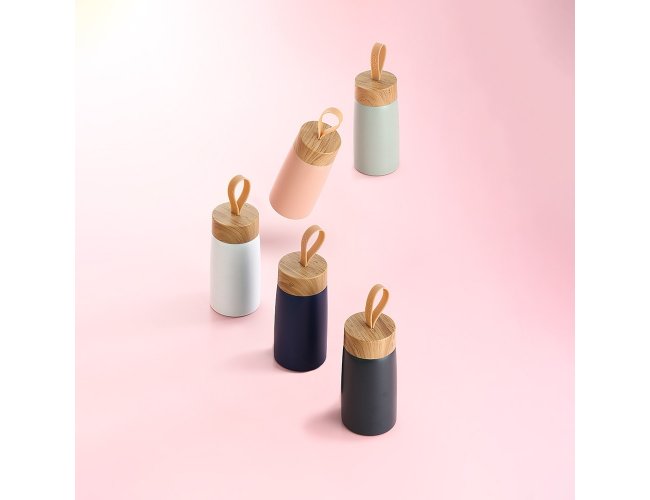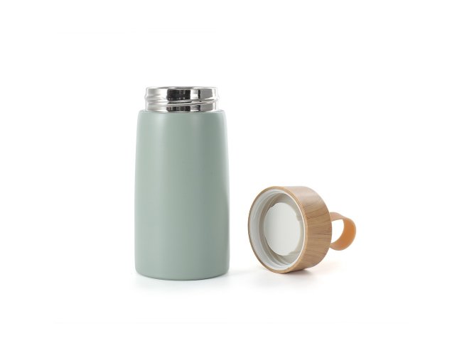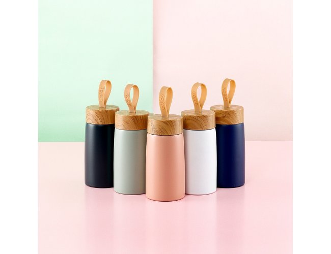 Garrafa inox 304 com parede dupla, capacidade de 250ml. Contém tampa plástica com design de bambu e alça de silicone para transporte.