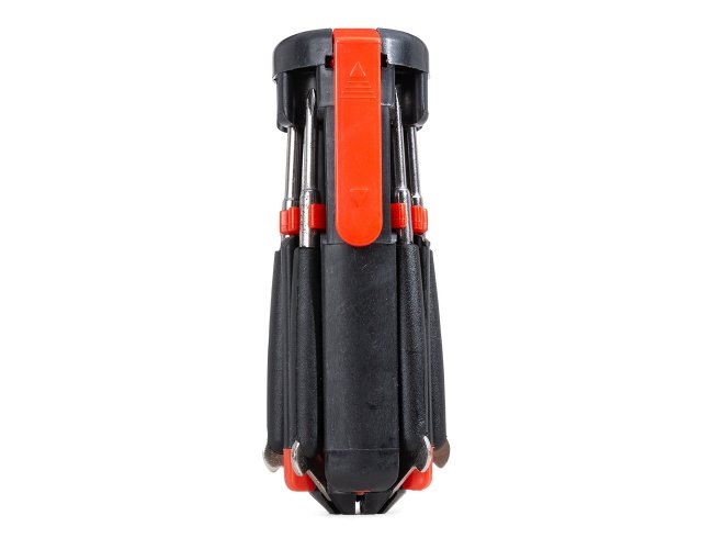 Kit ferramenta retrátil com 7 chaves e lanterna de 6 Leds. Material plástico, possui 3 chaves Philips; 3 chaves de fenda; chave de ponta dupla sendo um mini Philips e uma mini Fenda em cada extremidade, basta desrosquear as tampas para visualizá-las. Clip vermelho com setas explicativas para abertura do compartimento de pilhas, pressione a localização da seta superior e empurre ao mesmo tempo a parte inferior para remoção, necessita de 3 pilhas AAA(não acompanha).