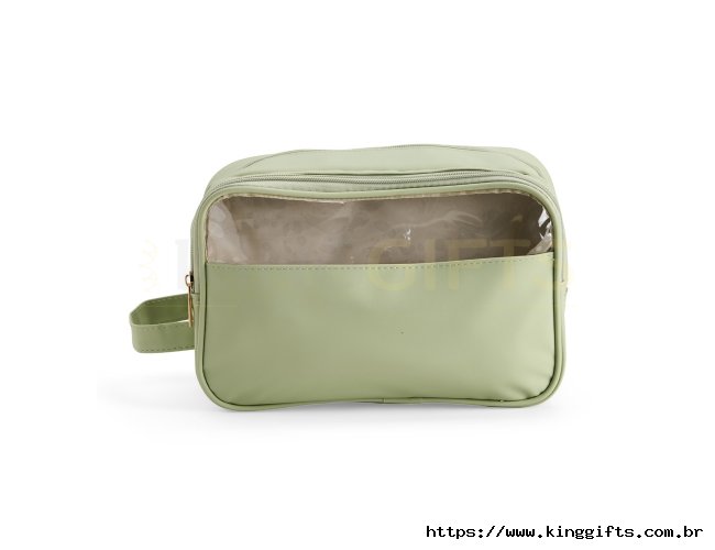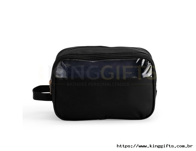 Nécessaire confeccionada em filme sintético de poliuretano impermeável. Possui dois bolsos no compartimento interno principal, sendo um com fechamento em zíper e outro em tela de nylon. Dispõe ainda de compartimento frontal com viseira e revestimento interno em PVC, ideal para guardar itens molhados.
