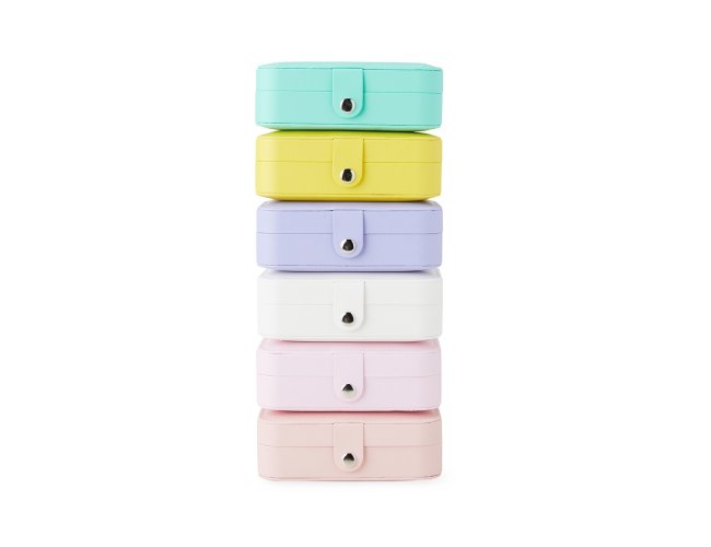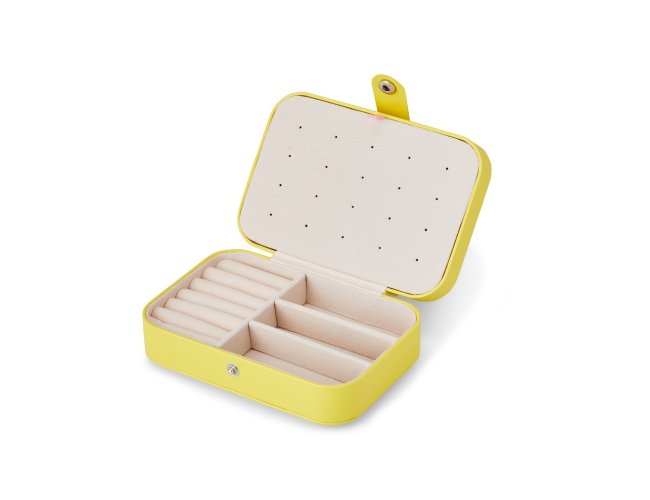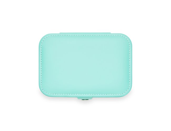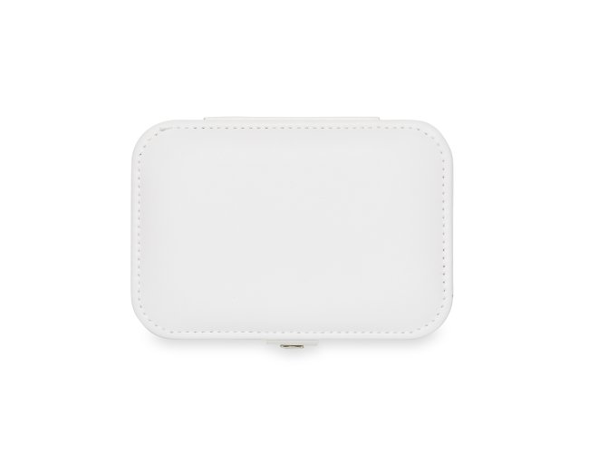 Porta joias de couro sintético com revestimento aveludado. Possui compartimentos internos para anéis, pulseiras, colares e placa para brincos.