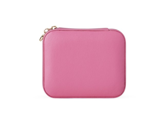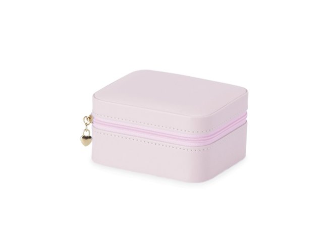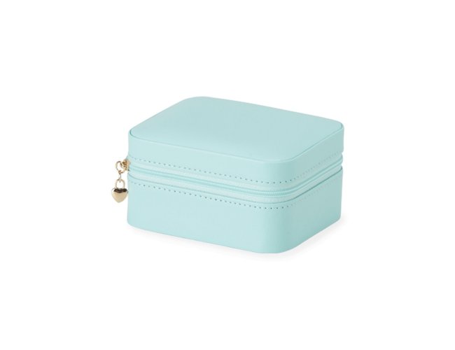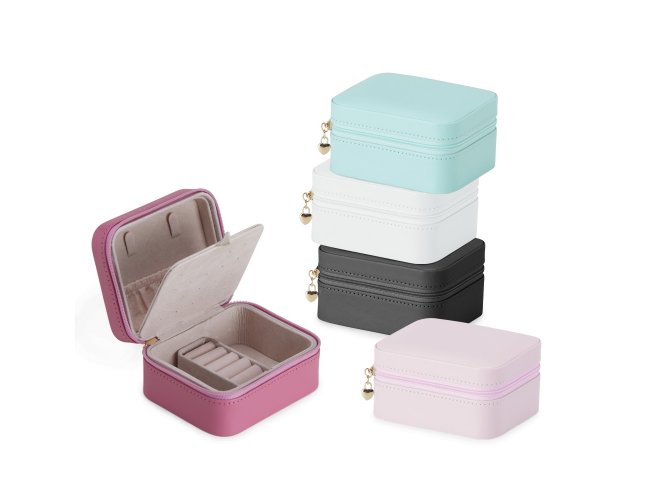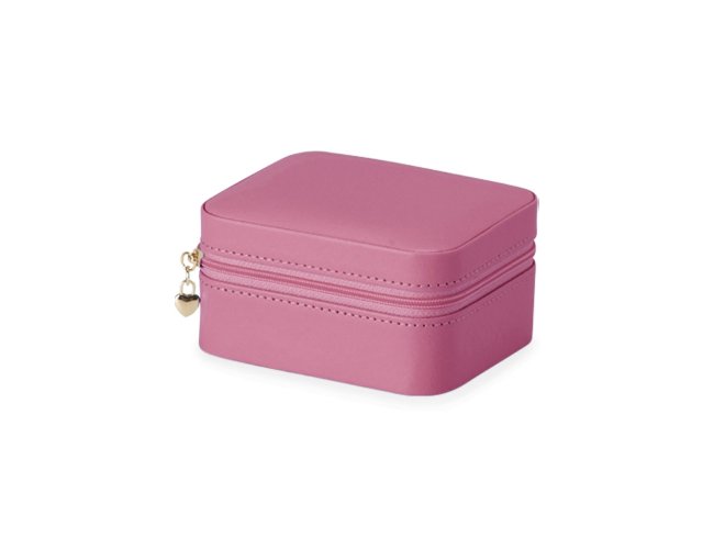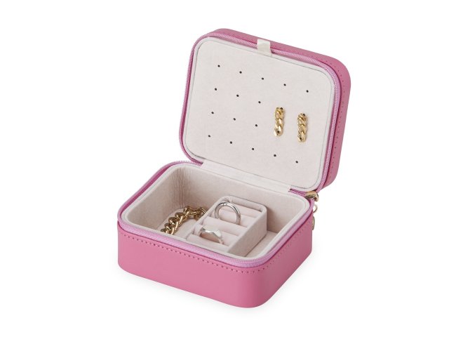 Porta joias de couro sintético com revestimento aveludado. Possui compartimentos internos para anéis, brincos, pulseiras e colares.