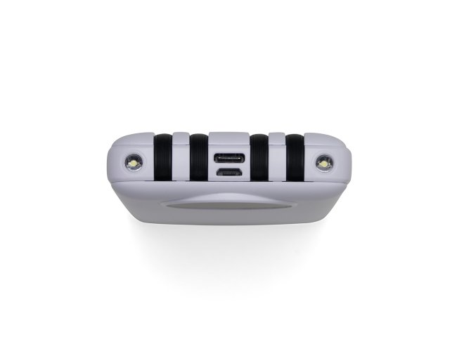 Carregador portátil de 10.000mAh com display digital indicador de bateria, contém duas lanternas de led e quatro cabos de saída acoplados, sendo: saída Lightning, saída Tipo-C, saída V8 e saída USB. O carregador possui uma porta USB dupla (entrada e saída) com carga rápida e outras duas portas de entrada: V8 e Tipo-C. Acompanha cabo USB.
