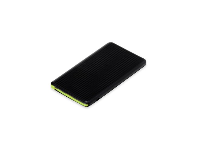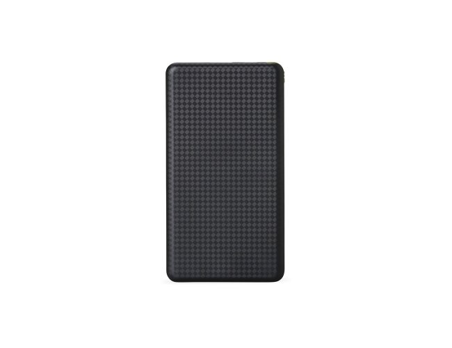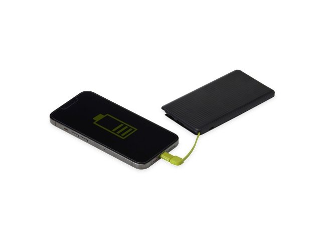 Carregador portátil plástico com 5.000mAh e indicador led de bateria. Possui entrada V8, acompanha cabo USB, adaptador lightning e adaptador tipo-C.