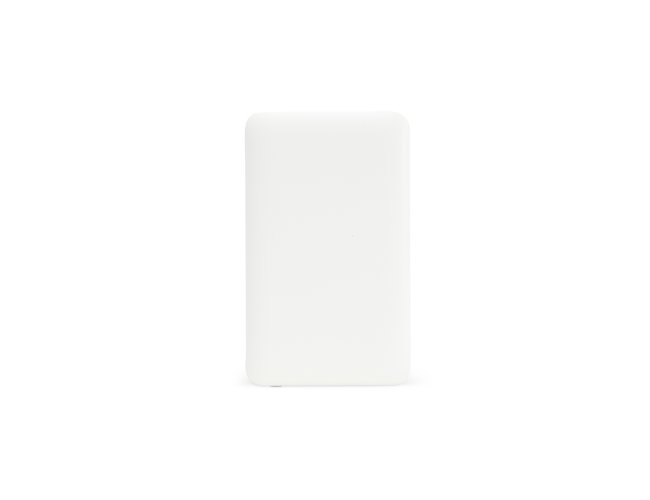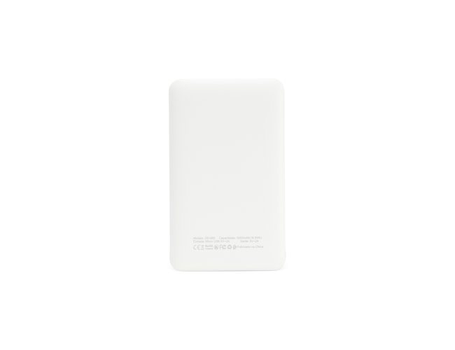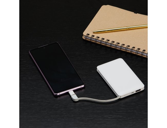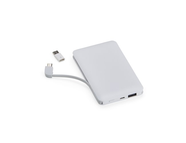 Power bank plástico de 5.000mAh com indicadores led de bateria e cabos acoplados: Lightning e V8. Acompanha cabo USB-V8 e adaptador Tipo-C.