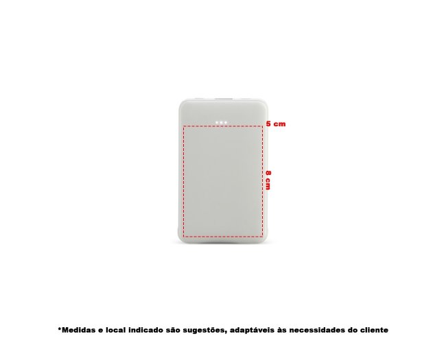 Power bank plástico de 5.000mAh com indicadores led de bateria e cabos acoplados: Tipo-C e V8. Acompanha cabo USB V8 e adaptador Lightning.