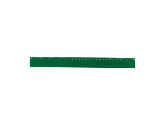 Régua plástica colorida de 30 cm com verso liso, apenas na cor branca possui detalhe em relevo no verso.