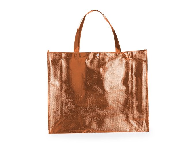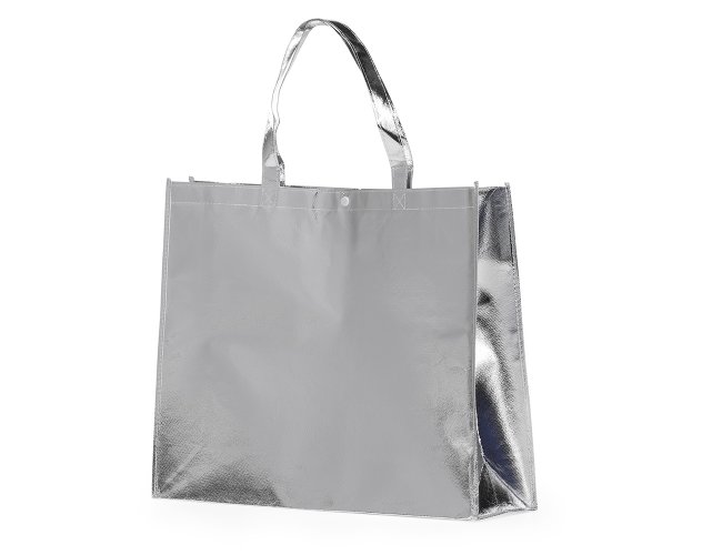 Sacola TNT metalizada com botão. Confeccionado em TNT com revestimento laminado, parte superior possui botão plástico para fecho.