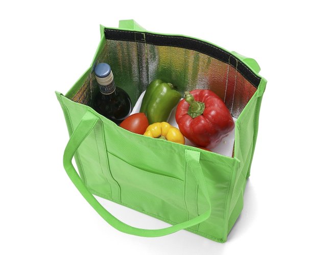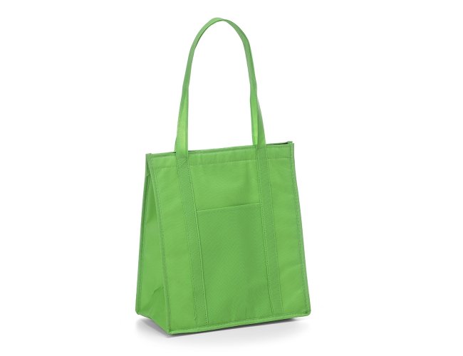 Sacola térmica com capacidade de 18 litros, contém fechamento em velcro e bolso frontal. Obs.: A capacidade de armazenamento com a sacola fechada é de aproximadamente 14 litros.