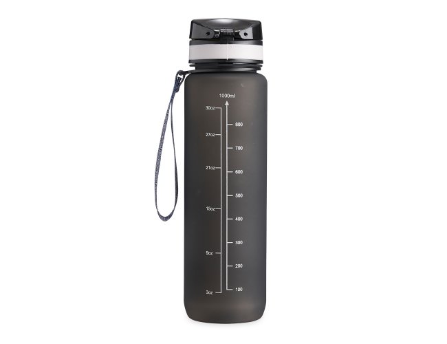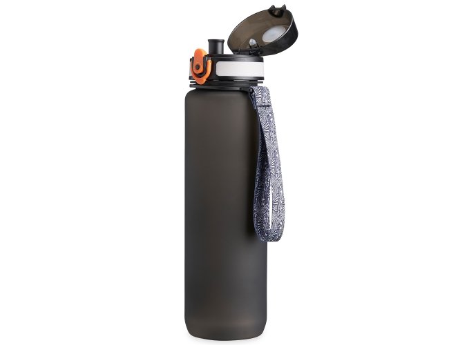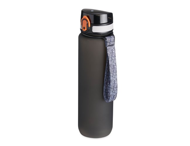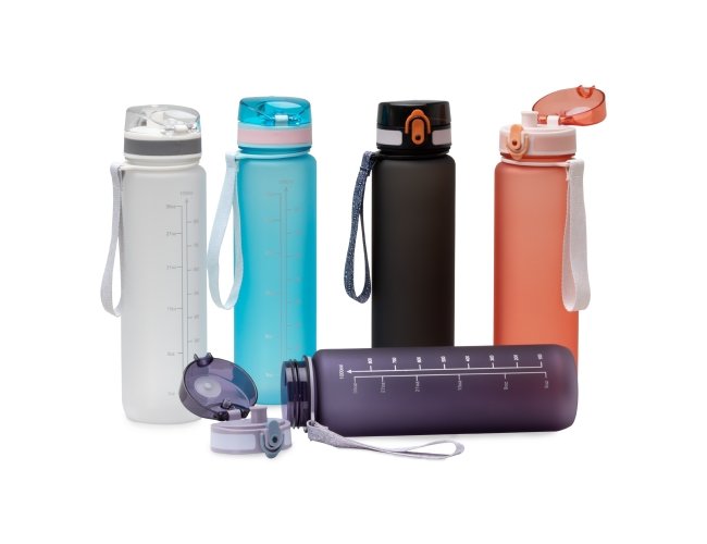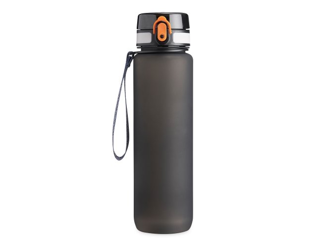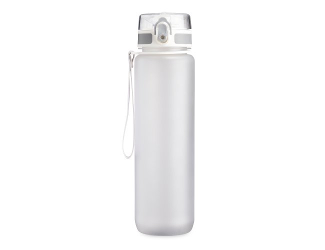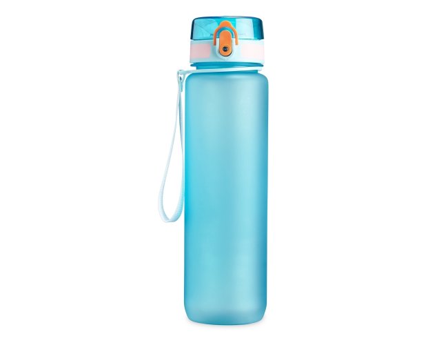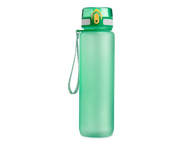 Squeeze plástica de 1 litro com tampa de acionamento automático e trava de segurança. Acompanha cordão de nylon.