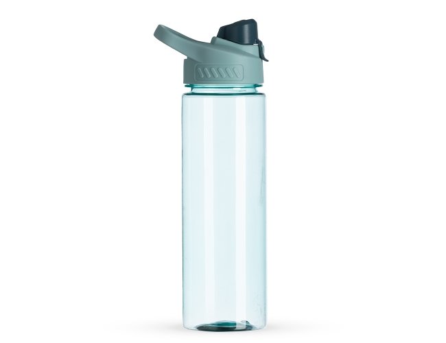 Squeeze plástico 700ml com alça para transporte, possui tampa principal rosqueável e tampa de proteção plástica com trava para o bocal.